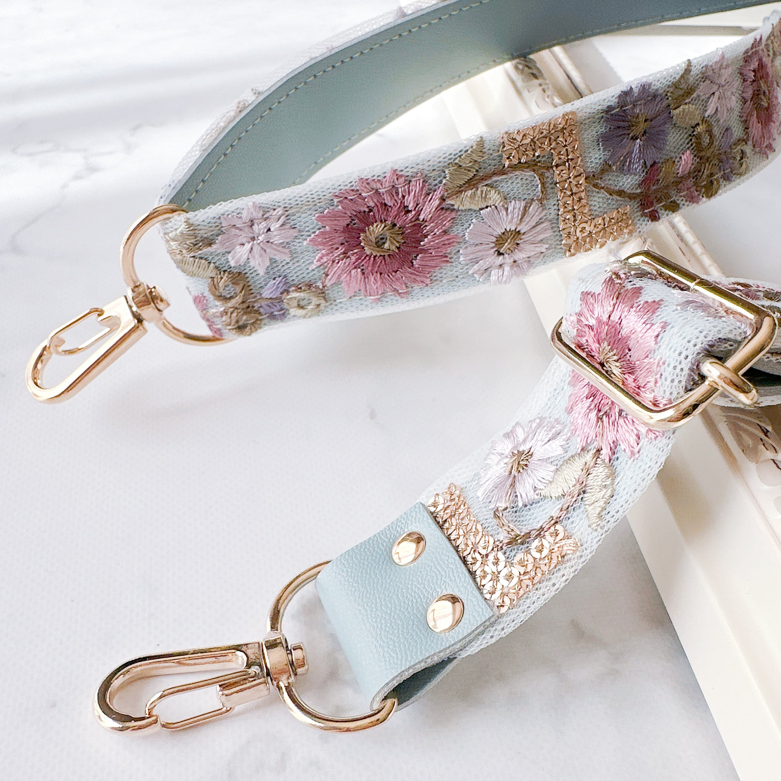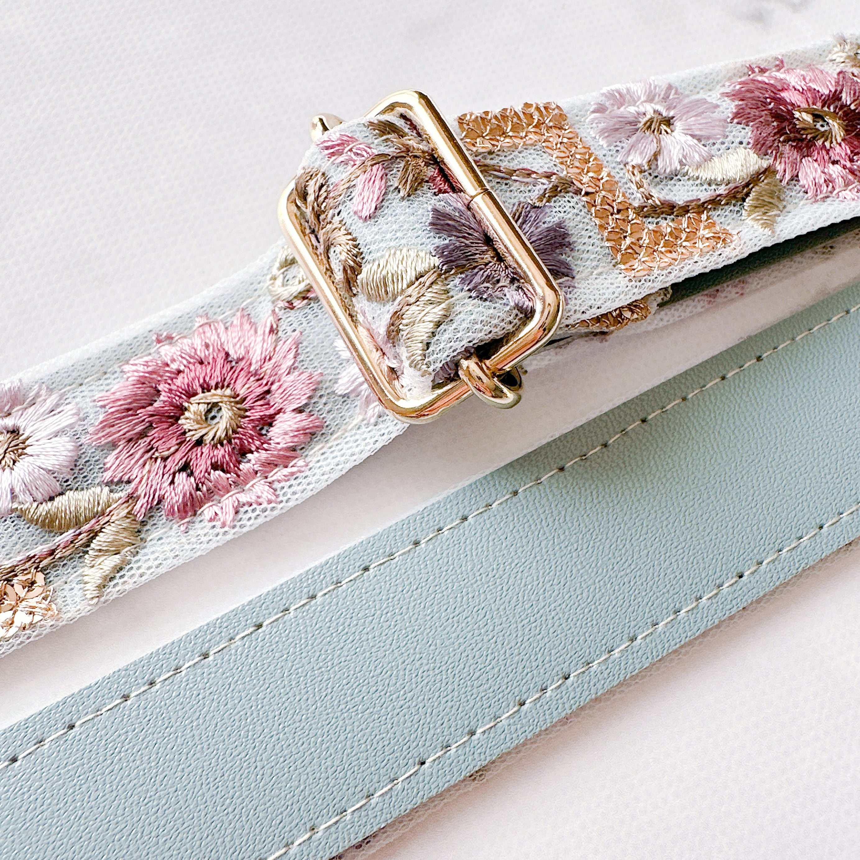 くすみカラーのシフォン素材に刺繍をあしらったリボンにフェイクレザーを合わせたデザイン。