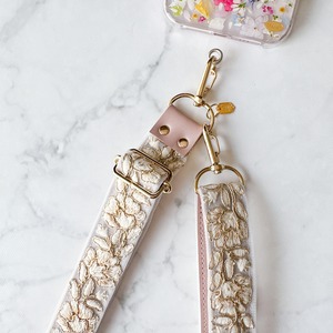 上質な刺繍リボンとフェイクレザーを組み合わせた、大人女性のためのスマホショルダー。