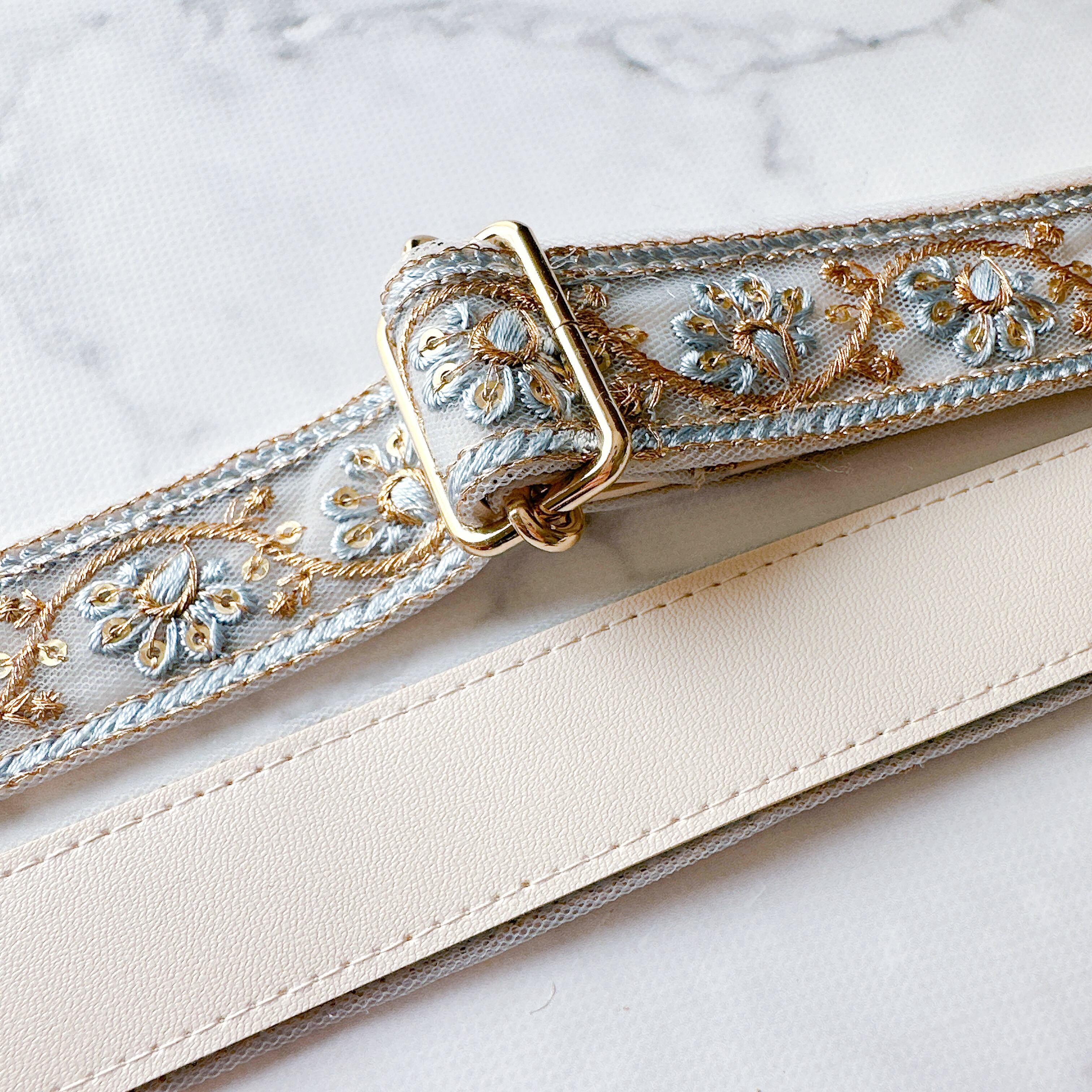上質な刺繍リボンとフェイクレザーを組み合わせた、大人女性のためのスマホショルダー。